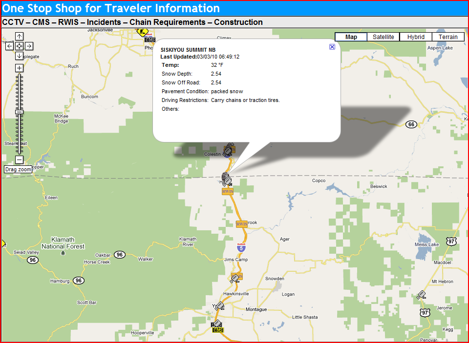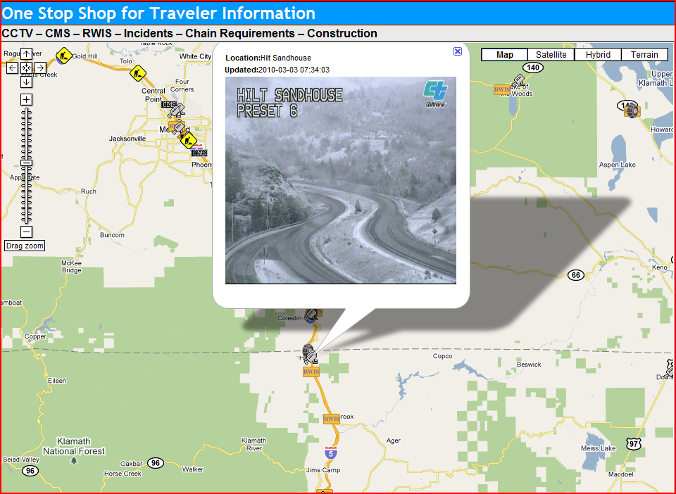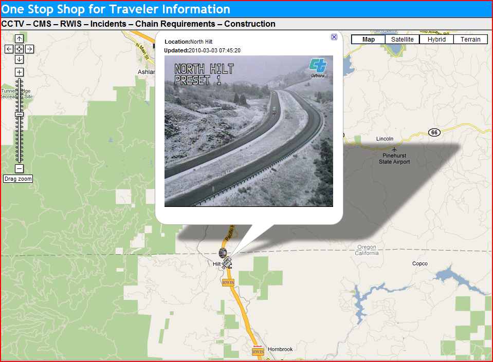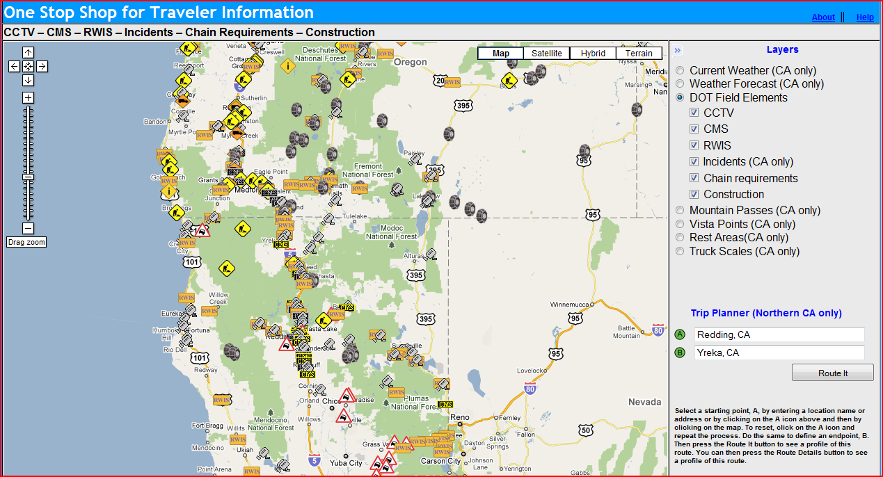 Here's the OSS home page. The DOT Field Elements are shown by default. These include cameras, signs, weather stations, incidents, chain requirements and construction. You'll always see a lot of elements on these pages because Caltrans and ODOT have deployed a signficant number of intelligent transportation systems to help travelers to travel safely: