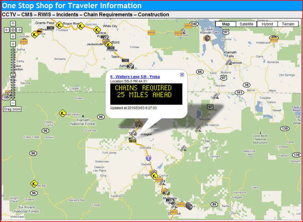 I zoomed in on an active message in the next screenshot. You'll see the message, "Chains Required 25 Miles Ahead" displayed as you would see it when driving by the real sign on north-bound Interstate 5 at Yreka: