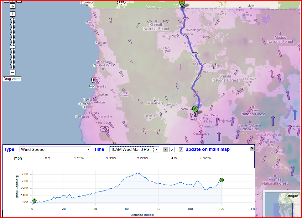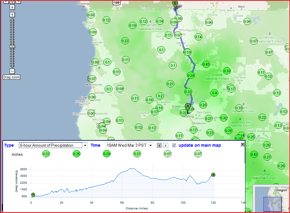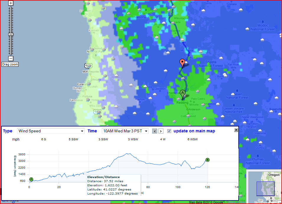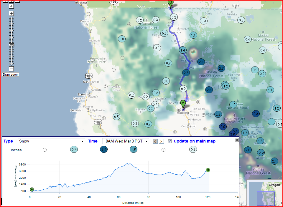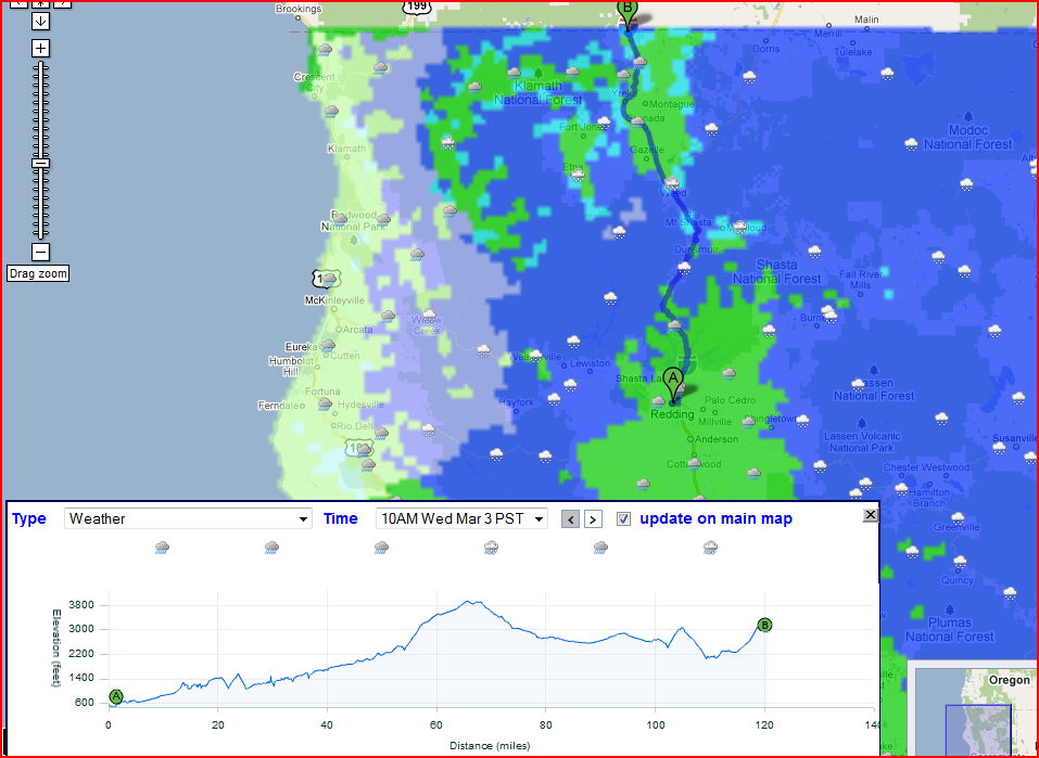 OSS includes a feature called the "Trip Planner". We use Google Maps routing to generate a route and then display weather forecast data along the route and along an elevation profile of the route. This morning, conditions were forecast to change from rain to snow between Redding and the Pass.