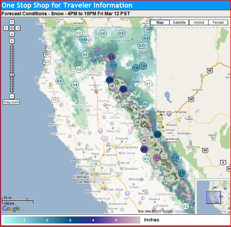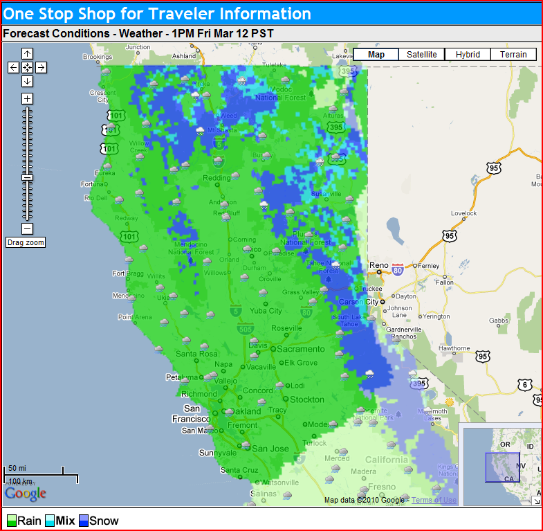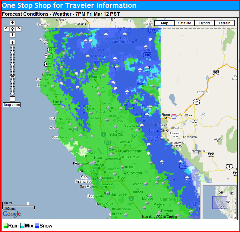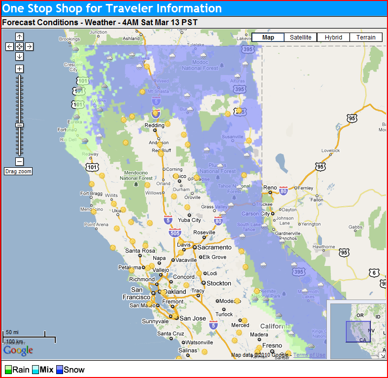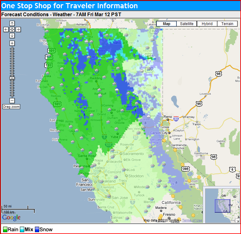 One Stop Shop includes digital forecasts from the National Weather Service (NWS). We present this in a graphical fashion on the map, consistent with NWS presentation. At present, this display is only shown for California.The forecast for today shows a lot of activity (rain, snow and mix) in Northern California: