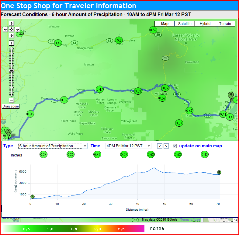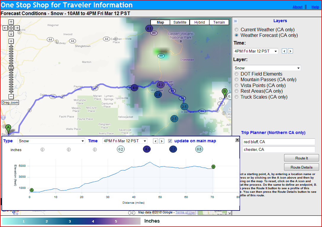 The Trip Planner can be used to examine the situation along a particular route. Here, we've chosen a route from Red Bluff, CA to Chester, CA. The route detail shows an elevation profile along this route. Sure enough, there is a significant change in elevation and significant snow potential at higher elevations along the route: