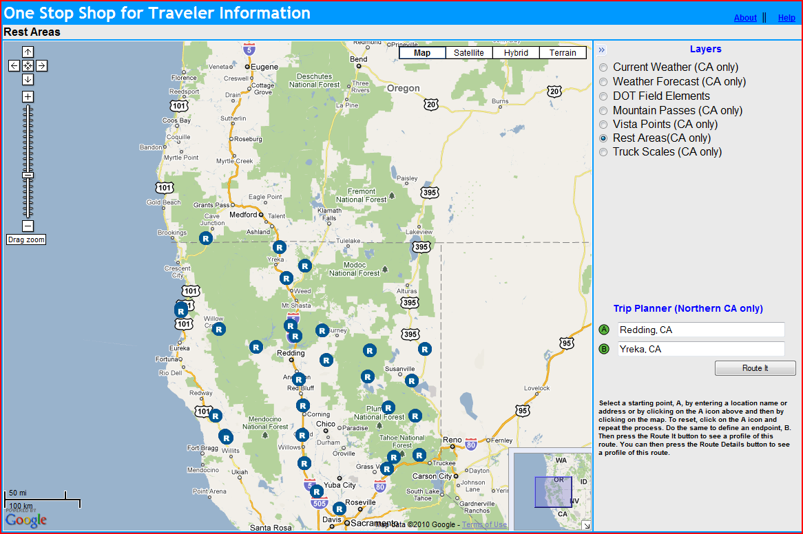 When planning a drive on rural roads, it’s a good idea to keep track of towns and facilities so you don’t find yourself in a tough spot. One-Stop-Shop includes several facility types in California including rest areas and truck scales. In the following screenshot, we’ve selected the “Rest Areas” layer: