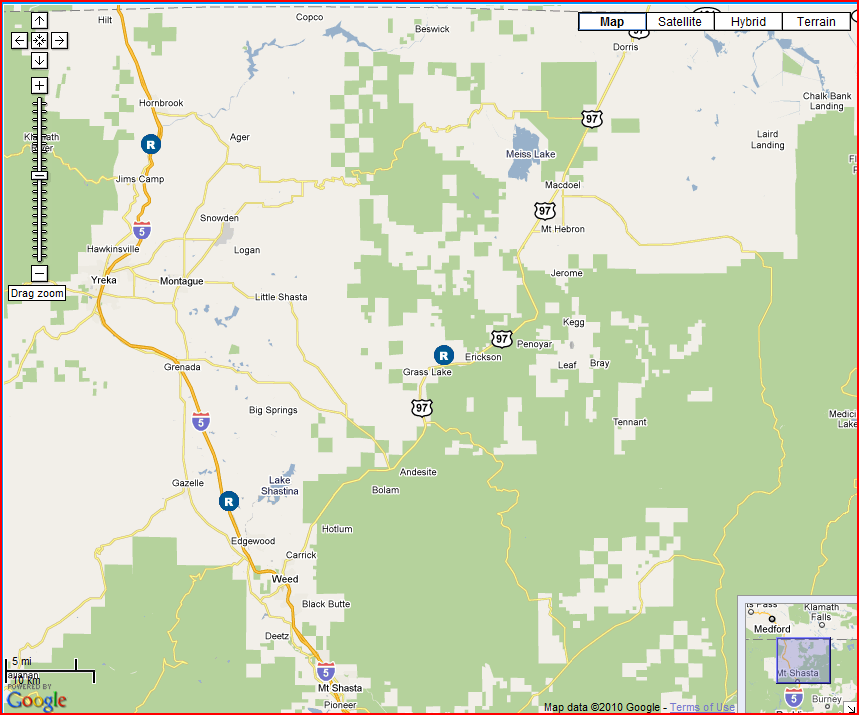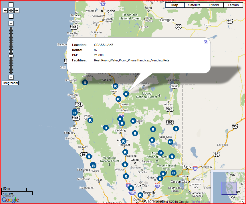 Here we’ve selected the “Grass Lake” rest area off of US 97 Northeast of Weed. Note the listing of associated facilities: