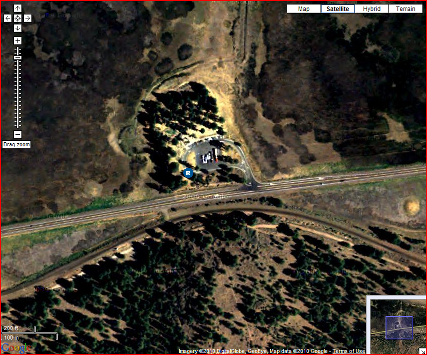 You’ll notice that we use Google Maps in One-Stop-Shop. If you toggle from Map view to Satellite view and zoom in further, you can verify that the rest area is there and you can get a rough idea of how access it from the road. This sort of pre-trip planning can help you to avoid surprises while en-route: