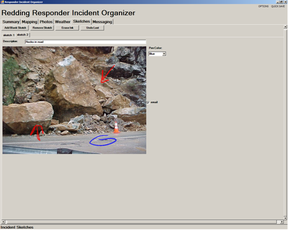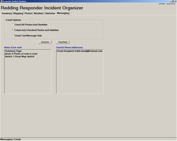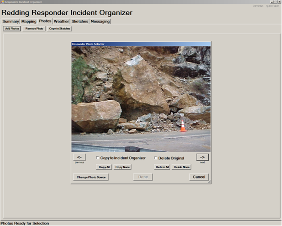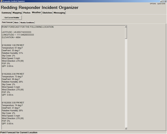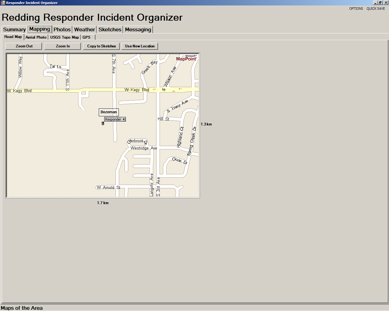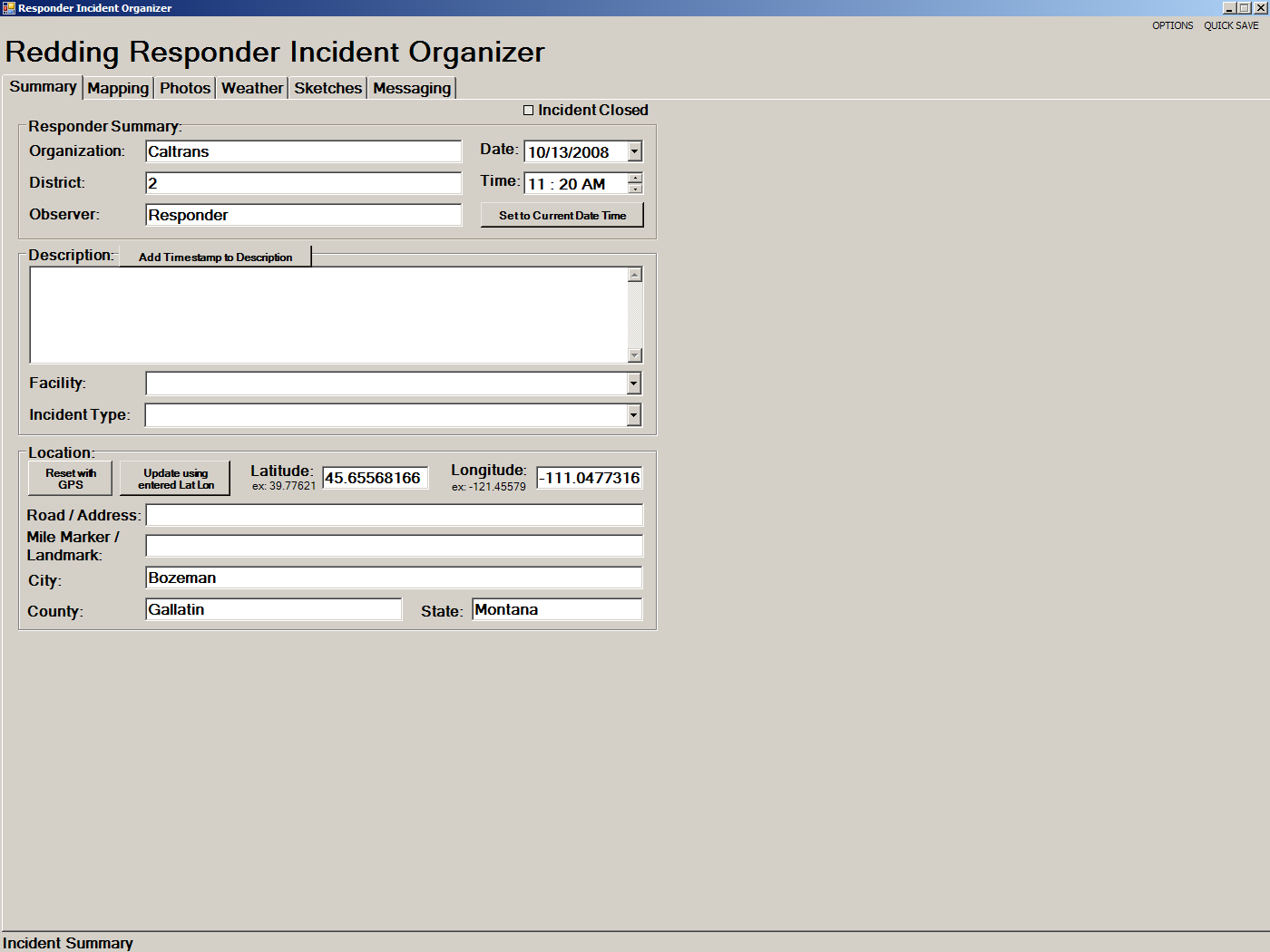 Clicking the "Open New Incident" button shows the summary tab of a new incident. The organization, district, person or team documenting the incident, as well as description and location of the incident can be entered here. The current date and time, and the GPS coordinates of the current position can be filled in automatically by clicking respective buttons. If mapping information is available at the current location, you are offered the chance to select the nearest road or address and have the Road/Address, City, County, and State boxes filled in automatically as well.